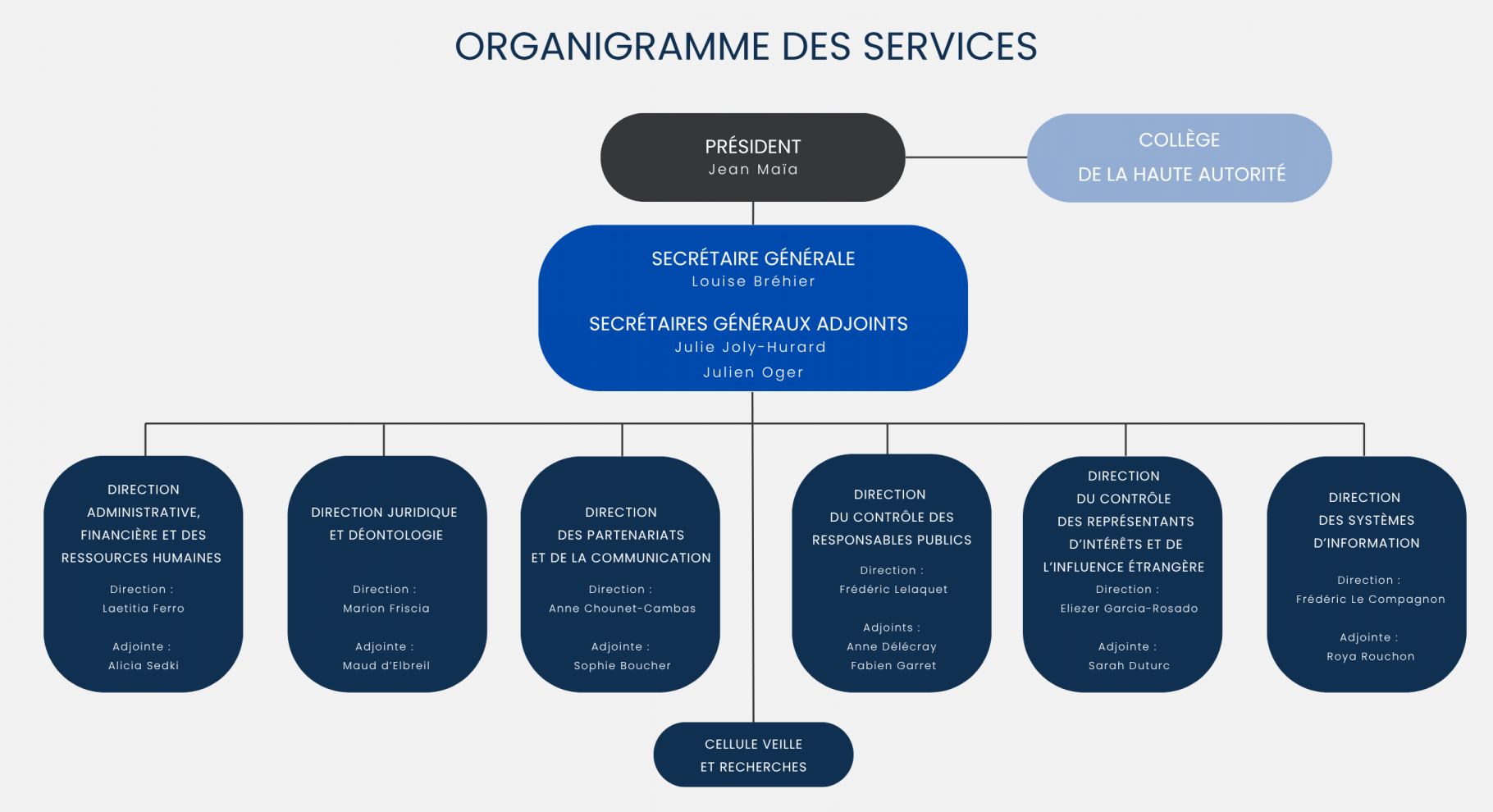 – Le secrétariat général assiste le président de la Haute Autorité et assure la direction administrative et financière de l’institution, la coordination des services et la préparation des travaux du collège de la Haute Autorité.
