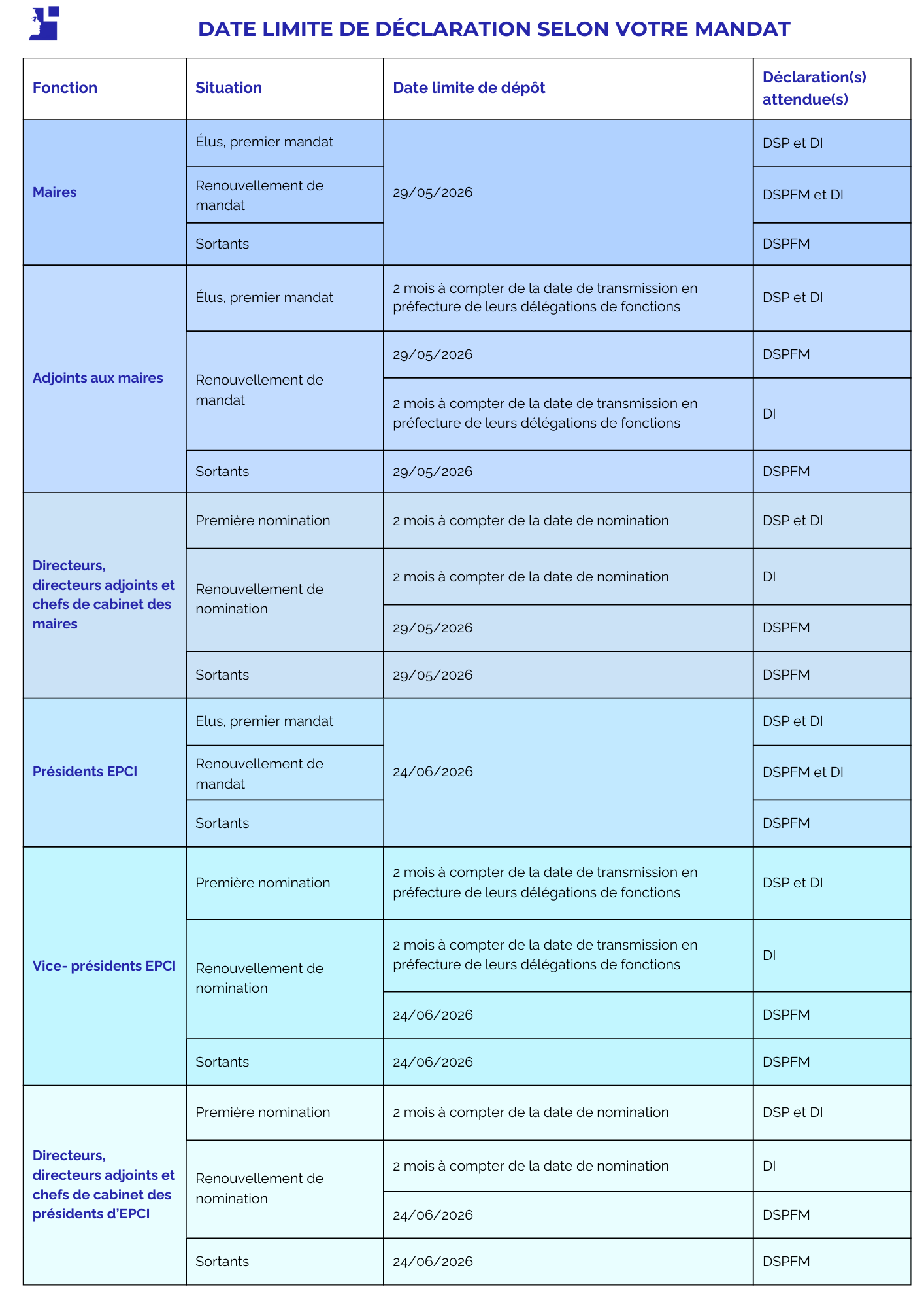 Afin de simplifier les démarches des candidats et élus, deux échéances uniques ont été fixées pour le dépôt des déclarations.