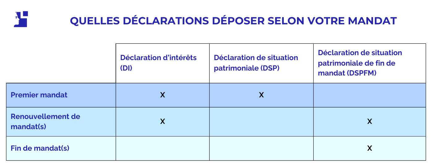 Le principe est que les personnes dont les fonctions ou mandats prennent fin à l’issue des élections, doivent adresser à la Haute Autorité une déclaration de situation patrimoniale de fin de mandat (DSPFM). Celles qui sont pour la première fois élues ou nommées à la suite des élections doivent adresser des déclarations initiales de situation patrimoniale (DSP) et des déclarations d’intérêts (DI).